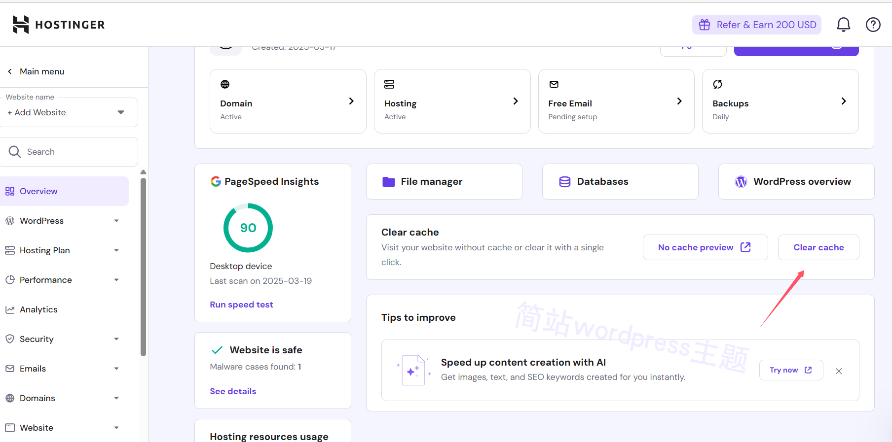 按照上面的截图,在hostinger主机的控制面板中找“Clear cache”,点这个清一下缓存,再看网站,就已经更新了。
