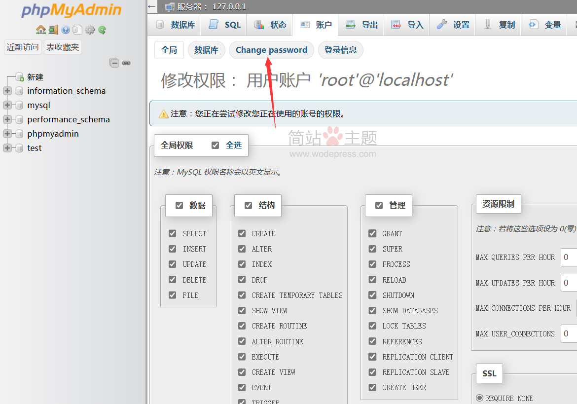 2、选择“帐户”,进入后,找到root,点击“修改权限”