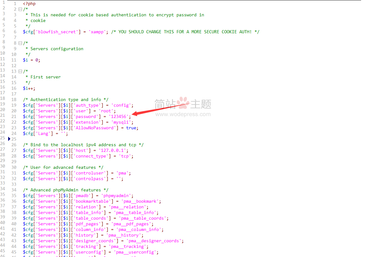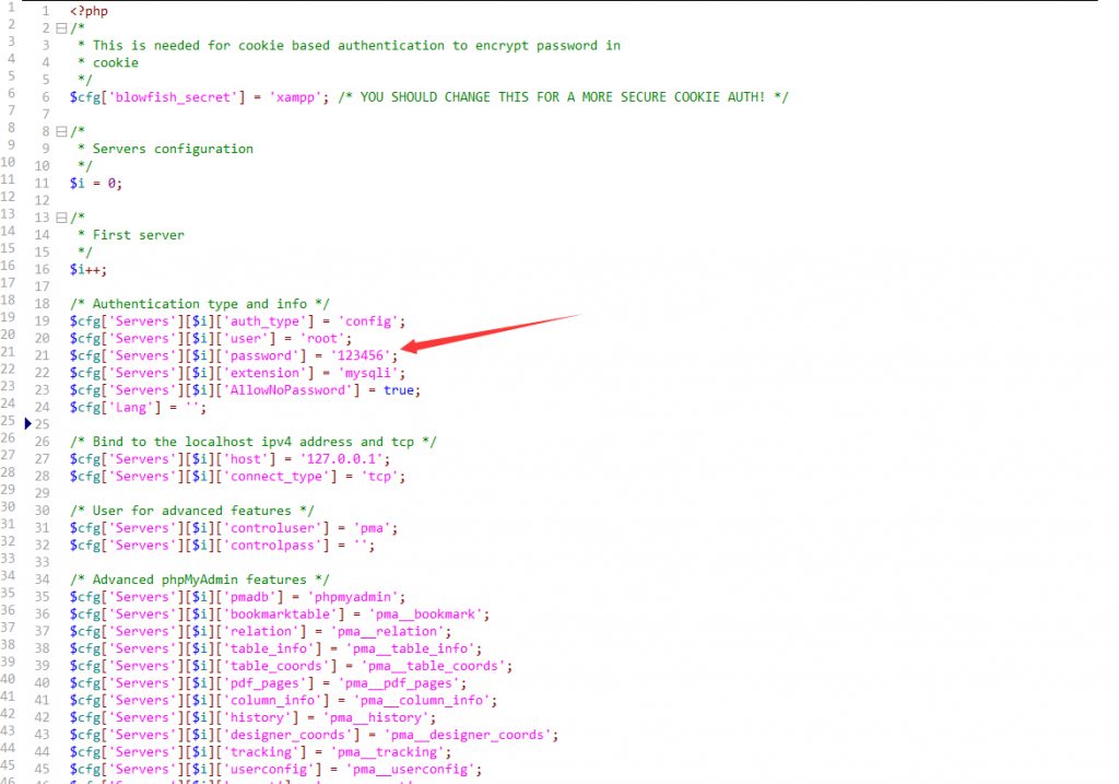 5、在XAMPP的安装目录中找到phpMyAdmin文件夹,进入后找到config.inc.php,在该文件中找到$cfg[‘Servers’][$i][‘password’] = ”;为其添加密码123456后保存。