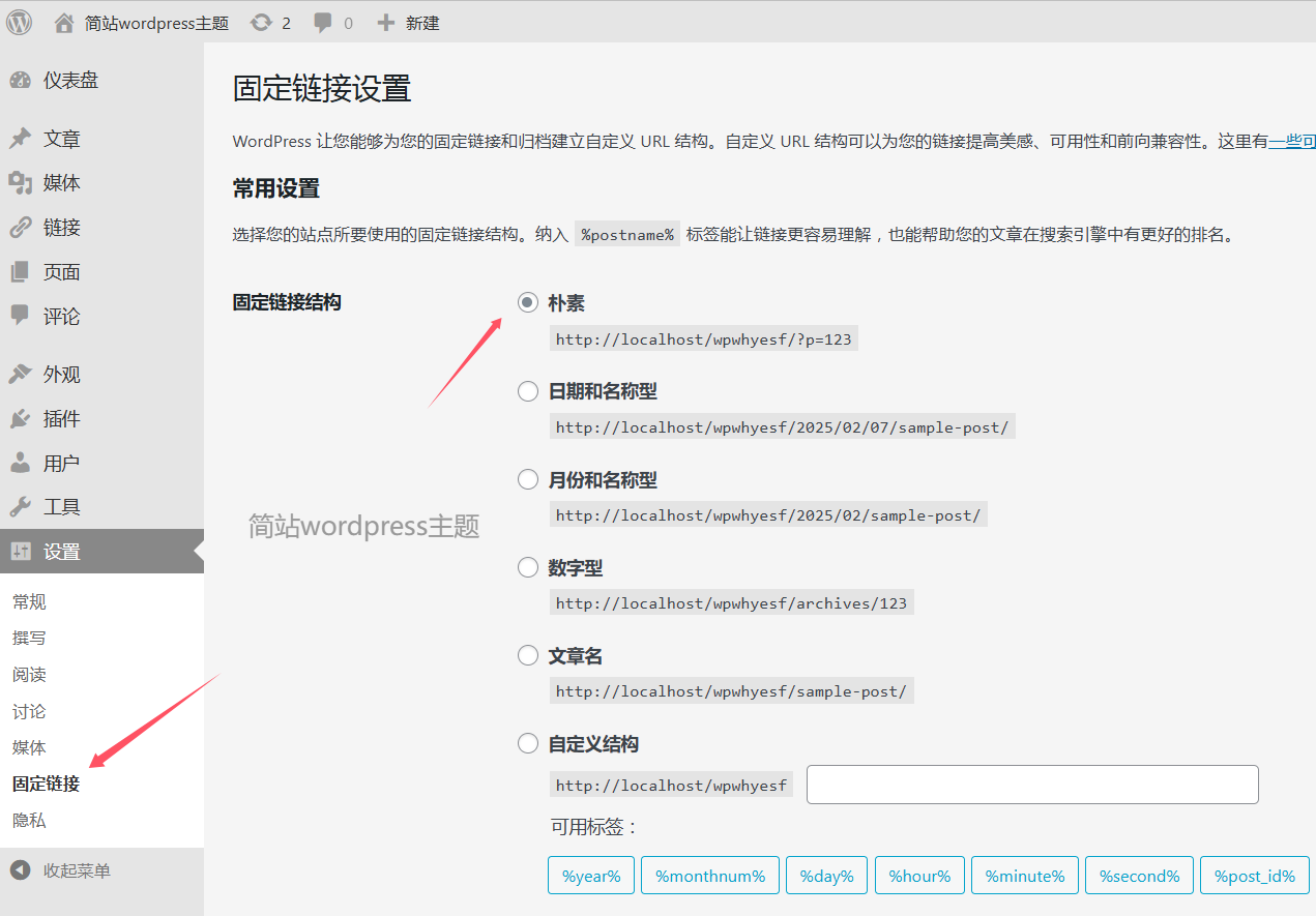 1、到后台找“设置”-“固定链接”,进入后把“固定链接结构”改为“朴素”保存。