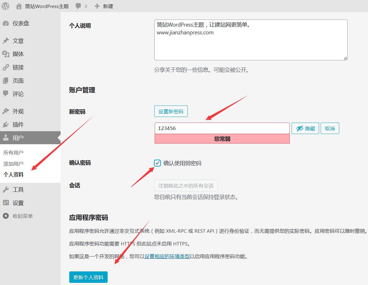 如果觉得系统给生成的密码太长不好记,也可以删除系统生成的密码,输入录入自己想要的密码。并点“确认使用弱密码”,再点“更新个人资料”就可以了。