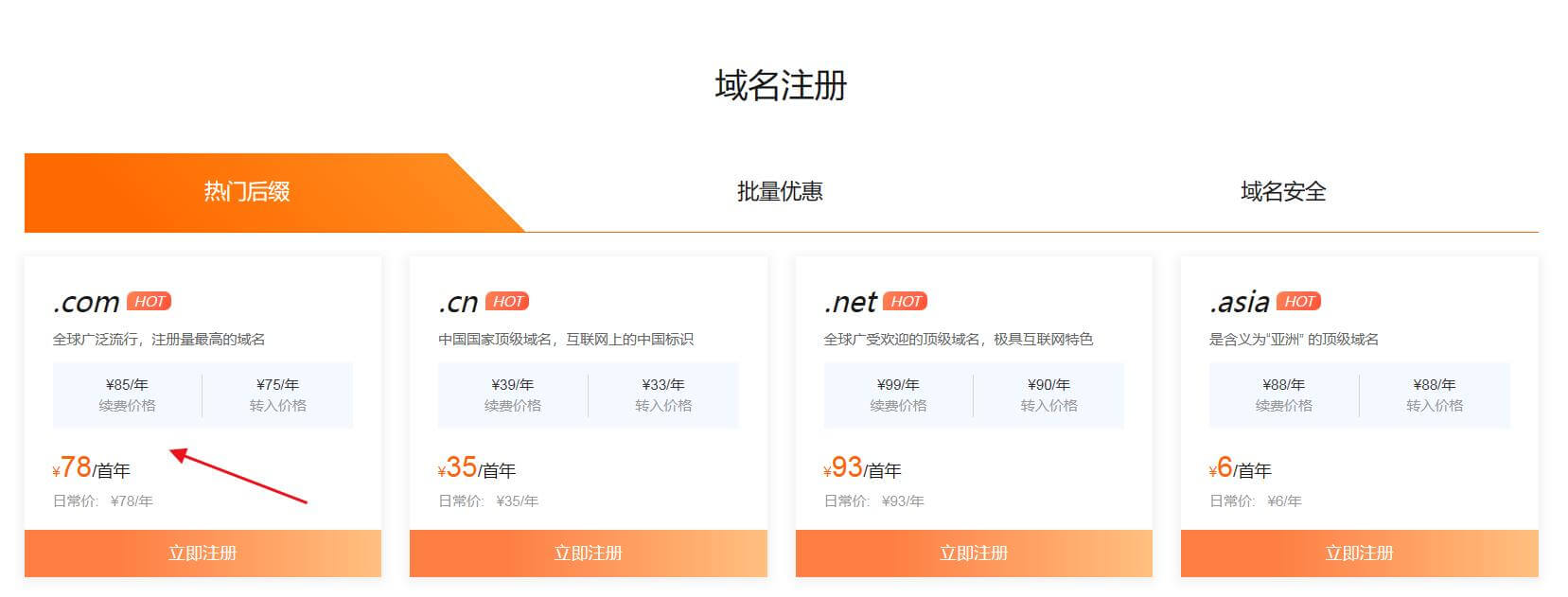建网站必须得有域名,注册域名国内的知名服务商有万网(阿里云)、新网等,以万网为例,现在的.com域名价格是首年78元,后面每年续费85元。