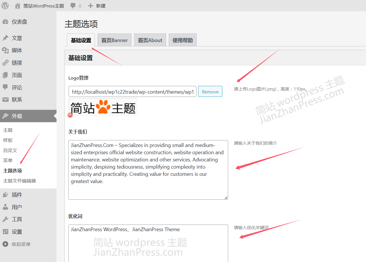 通过主题选项中的”首页Banner“等,设置网站首页的大图、文字等内容。