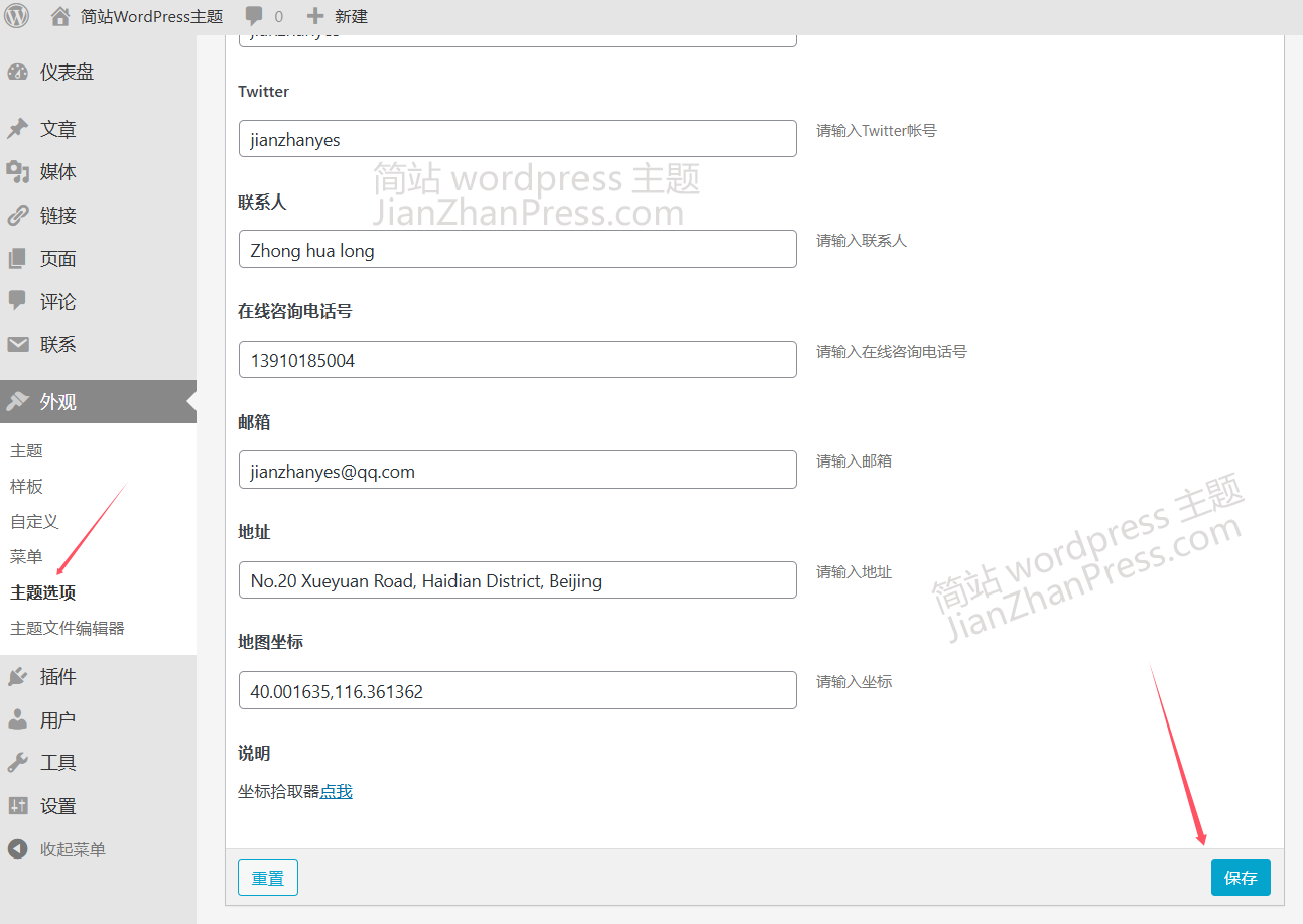 通过主题选项中的“基础设置”,可以设置网站的备案号、联系方式、地图等内容,设置完成后“保存”。