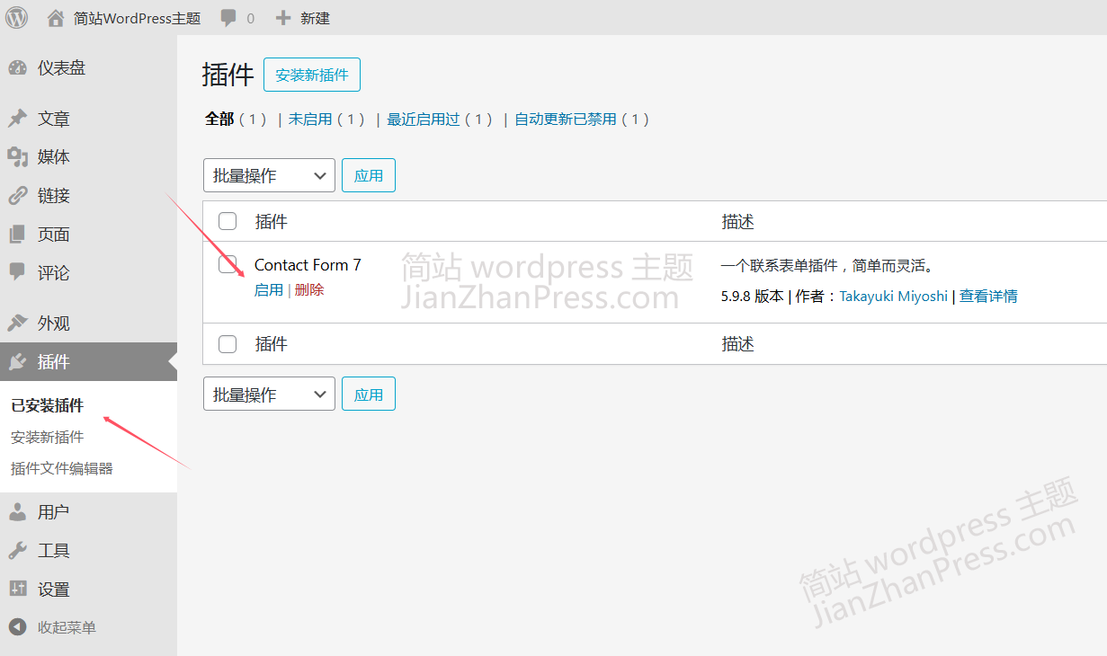 在wordpress后台找到”插件”,进入”已安装插件“,”启用“该主题所用到的插件。并对已启用成功的插件进行设置。