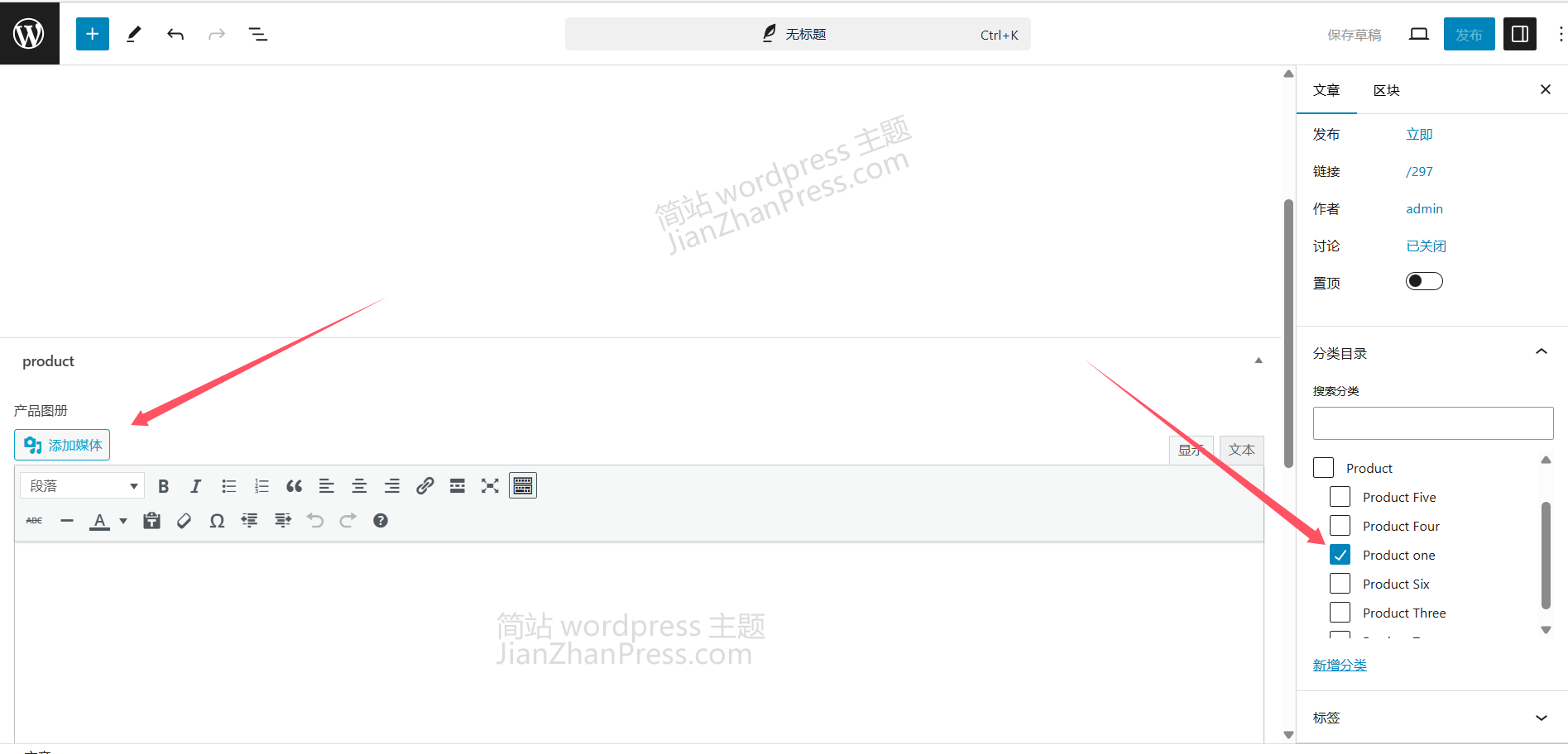 添加产品时,先选择产品所属的最终分类(注意一定要先选择分类,此处要选择的是product one分类(内容所属的具体分类),而不是product分类,不需要选择product分类)。