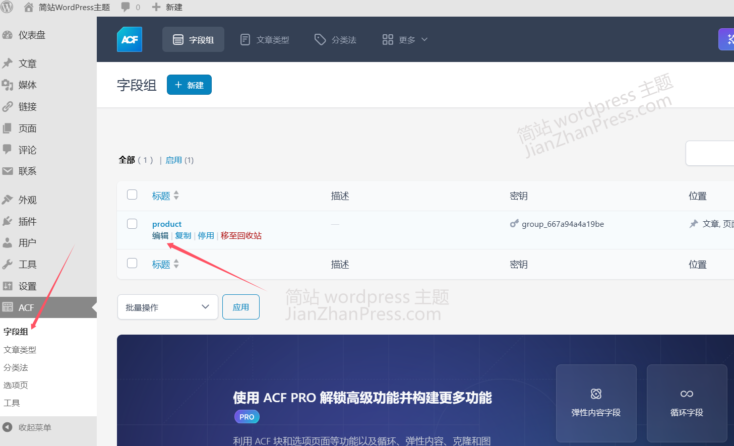 在后台找到”ACF“-”字段组“-编辑”product“字段,进入后会出现下面的界面