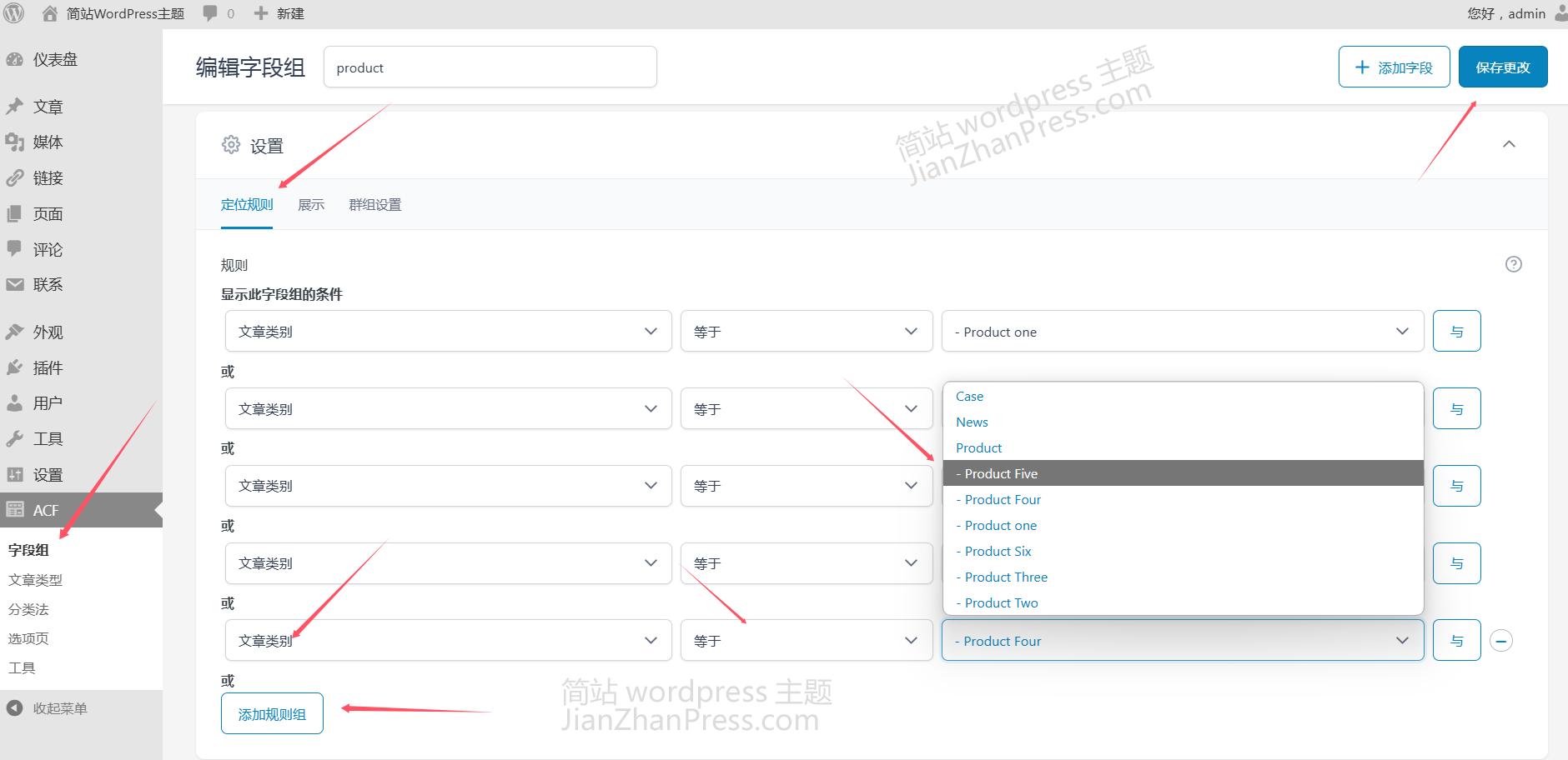 在这里点”添加规则组“,选择”文章类型“和”等于“,再选择要添加到这里的新建的产品分类”Product Five“。
