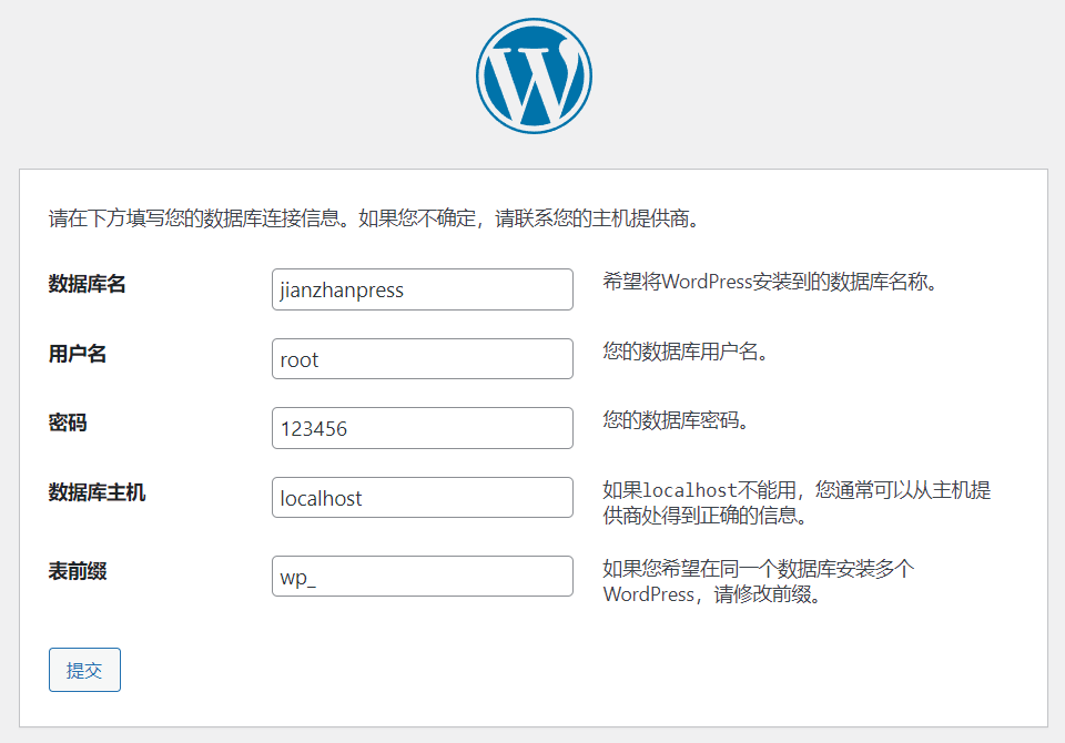 c、分别输入数据库名、数据库用户名、数据库密码后点“提交”。数据库主机与表前缀一般使用默认的localhost和wp_就可以。如果同一数据库中有多个wordpress程序,请务必将前缀修改为其它,比如,wp_jzp_。