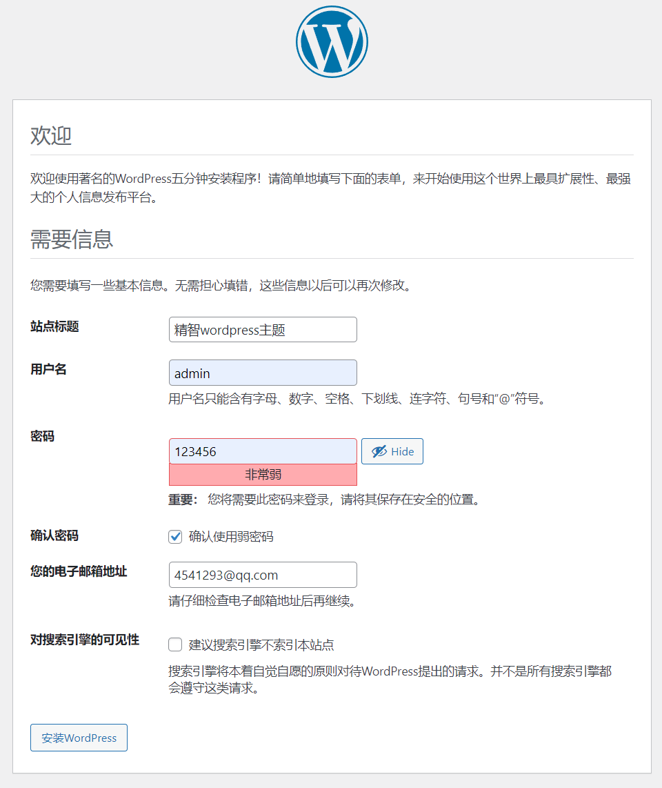 e、填写网站标题“简站wordpress主题”、用户名、密码、邮箱后点“安装wordpress”。