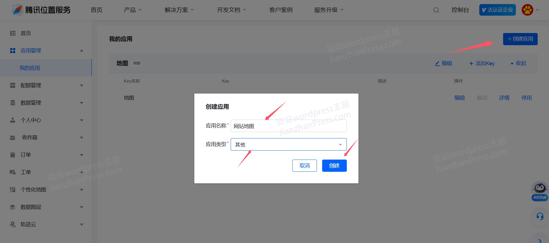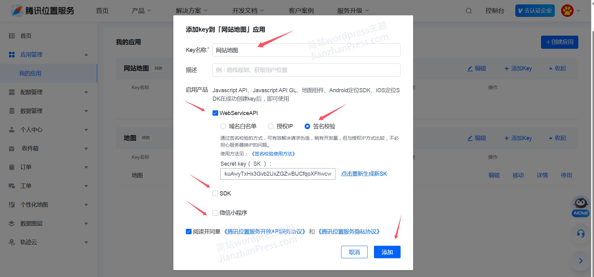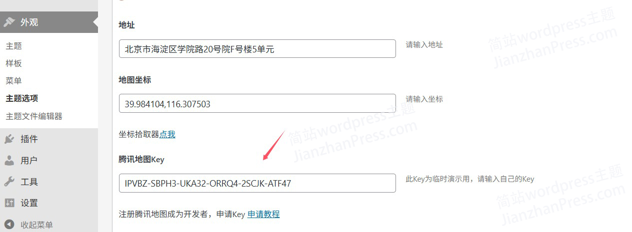 7、把这个Key复制到简站wordpress主题后台“主题选项”-“基础设置”-“腾讯地图Key”的位置,再点“保存”即可。