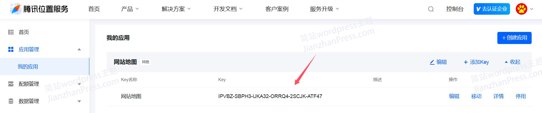 6、返回“我的应用”前面创建好的应用就会出现一个对应的Key。