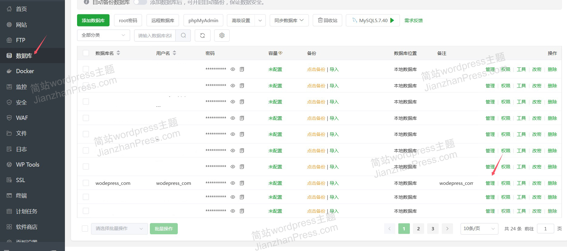 1、在宝塔面板后台左侧菜单中找“数据库”,进入数据库后,找到网站对应的数据库,点“管理”。
