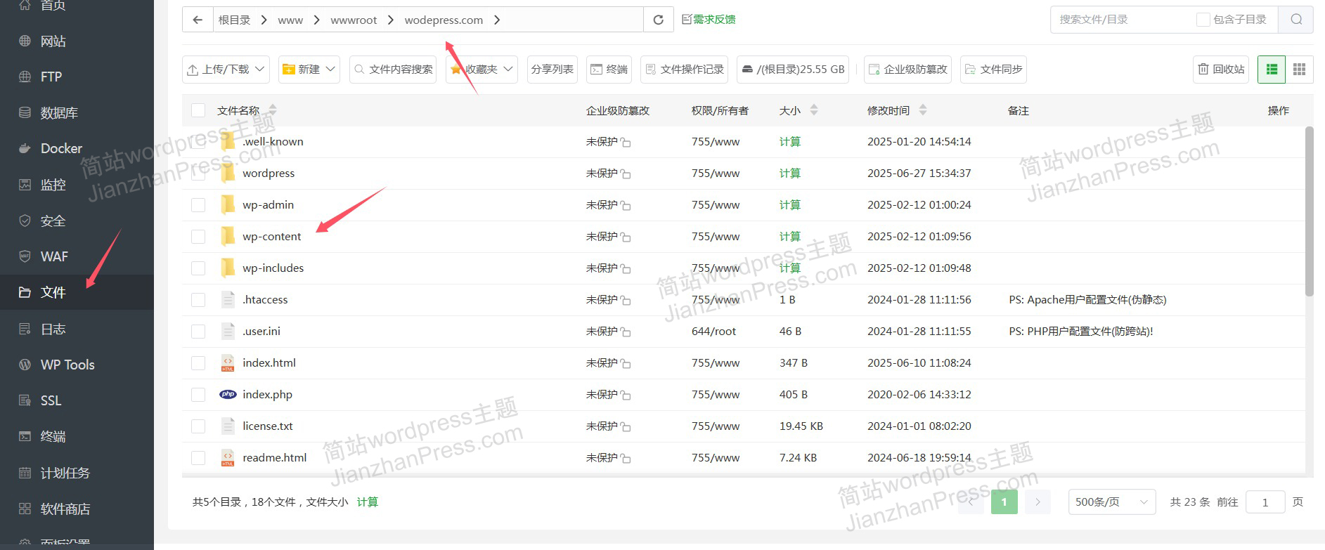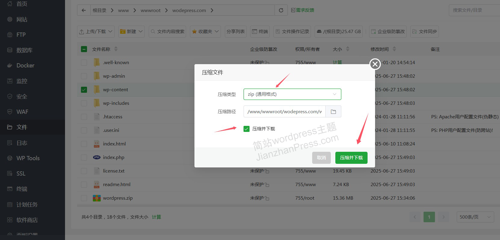 文件备份包含:主题文件、插件、上传的文件、语言包(这4个都在wp-content文件夹中,整体打包下载这个就可以)